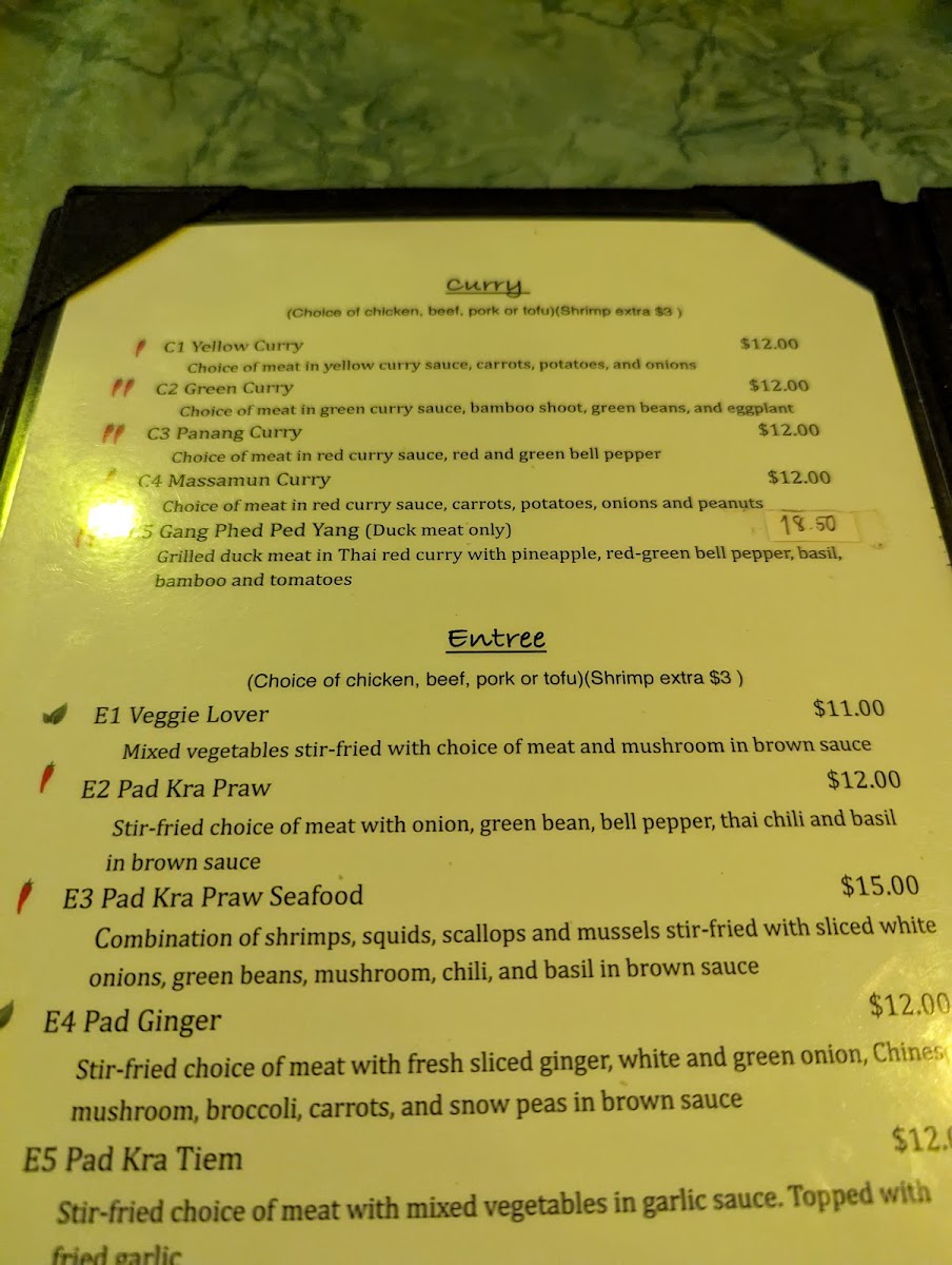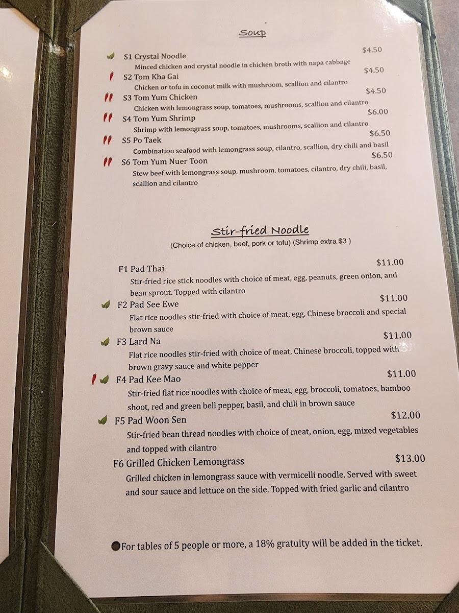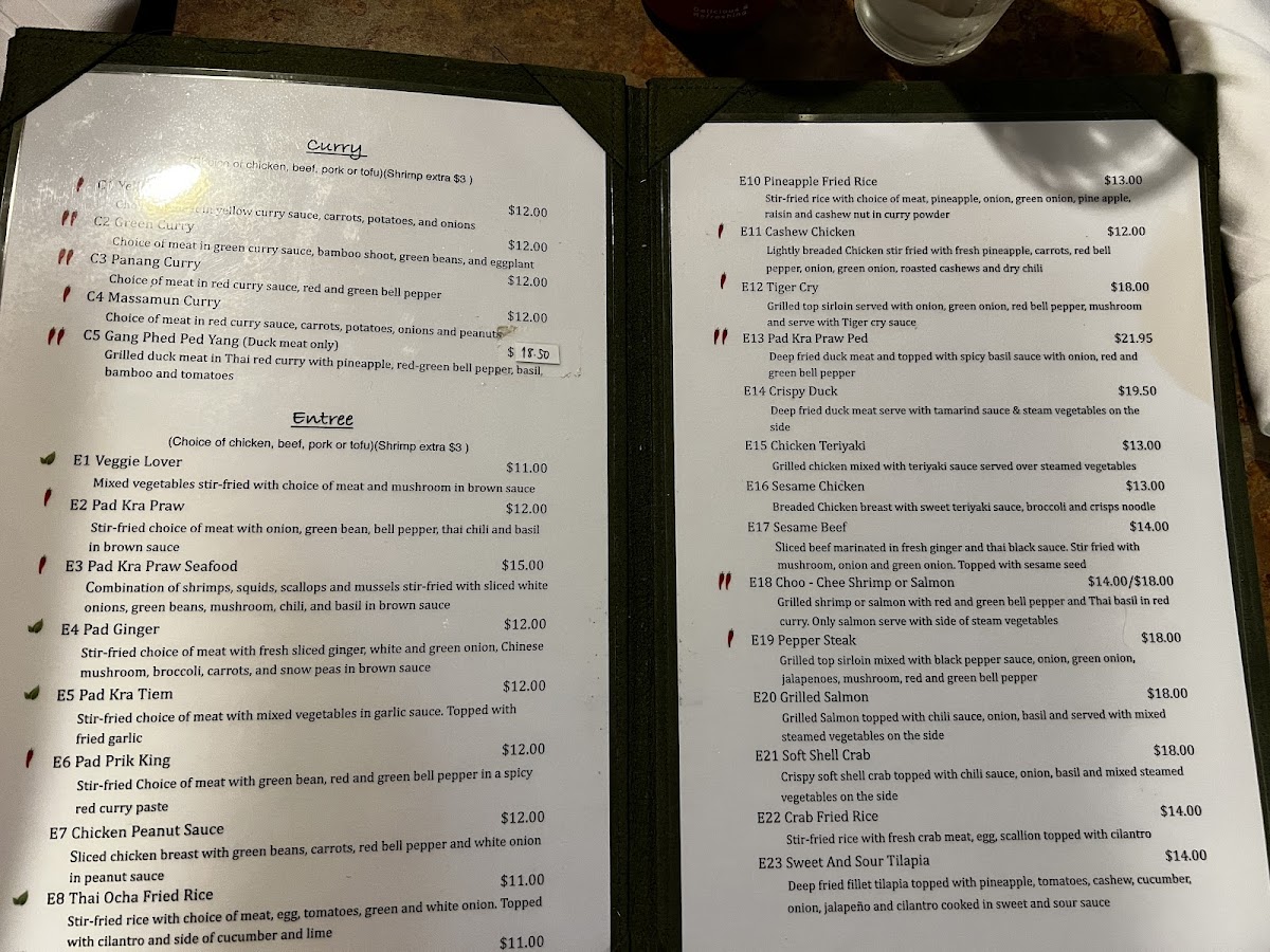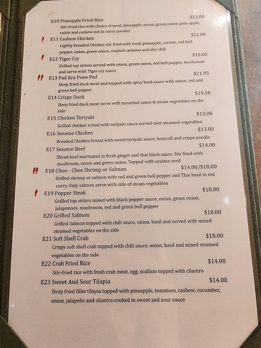 - Main Courses: Traditional Thai curries, rice dishes, and noodle entrees with choices of chicken, seafood, and vegetarian preparations.